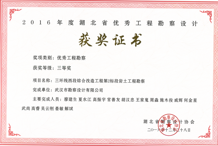 三環線西段綜合改造工程第2標段巖土工程勘察獲2016年度湖北省優