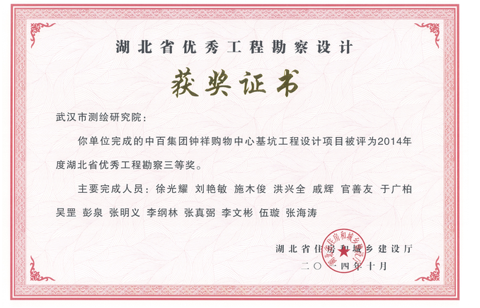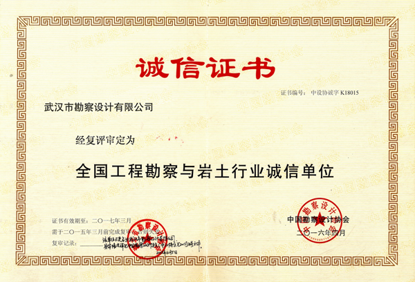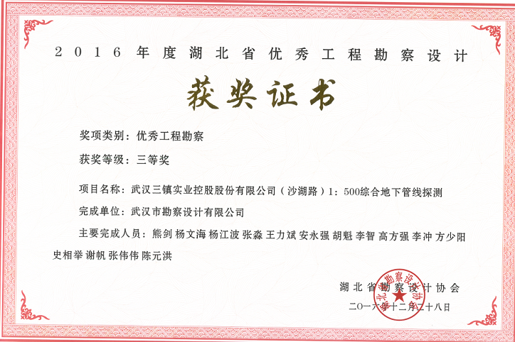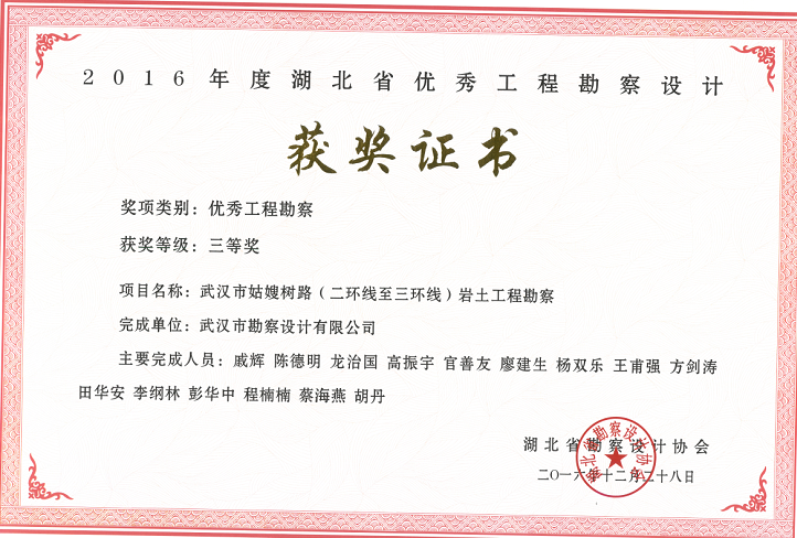 武漢市姑嫂樹路(二環線至三環線)巖土工程勘察獲2016年度湖北省
