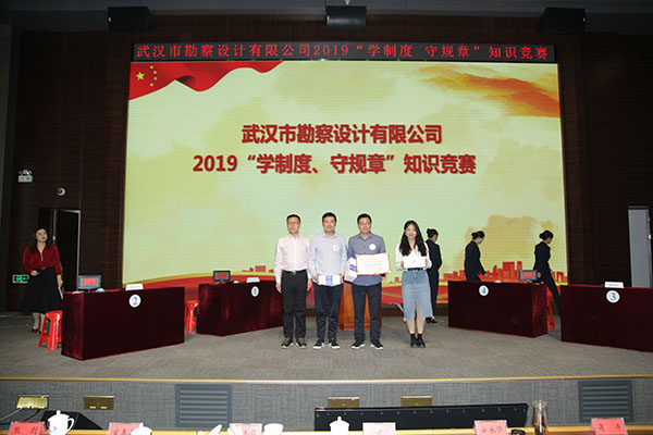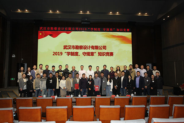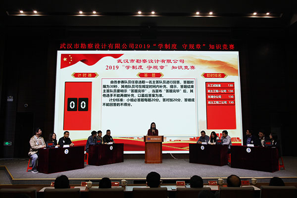為進一步加強員工對公司企業文化及各項規章制度的學習和認識,提高員工的綜合素養,10月30日上午,公司首次舉辦的2019年度“學制度 守規章”知識競賽活動在測繪院307學術報告廳成功舉辦。公司董事長廖建生,總經理施木俊,副總經理安永強、官善友、蔣濤,代理副總經理熊劍,代理總會計師龔瑋親臨現場指導并觀看了比賽,公司各部門負責人及員工代表共計100余人參加了活動。巖土工程一公司、巖土工程二公司、測繪工程公司、基礎工程公司、檢測監測公司、設計中心、地質環境中心、不動產咨詢中心、東湖分公司、新區分公司、臨空分公司、土工試驗室等12支生產部門代表隊共36名選手參加了此次比賽。
