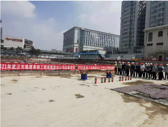 2021年5月8日上午,基礎工程公司漢口客運中心項目組織開展2021年度消防應急演練,武漢市勘察設計有限公司副總經理兼總工程師官善友,副總經理蔣濤,綜合部(黨群工作部)、技術質量安全部主要負責人,各生產部門相關負責人進行了觀摩演練。