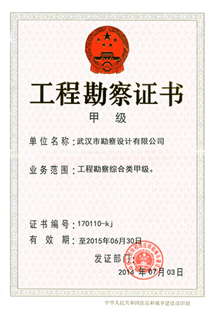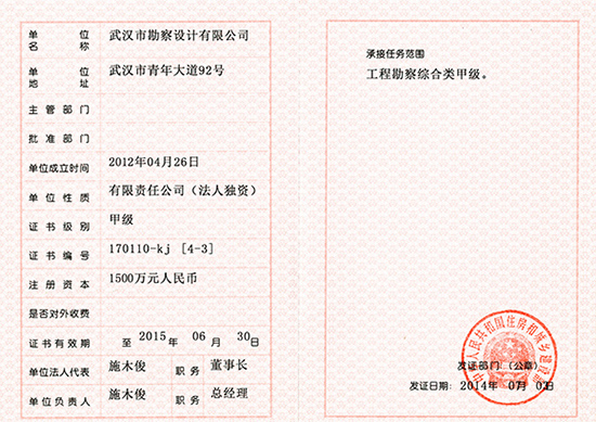 在我院領導的指導關心下,經過管理部門長久以來的大力支持以及全院相關人員的協作和努力,7月3日,我院勘察公司喜獲國家住建部頒發的工程勘察綜合類甲級資質證書。