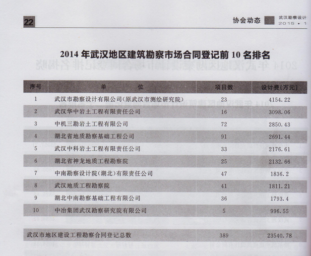 勘察公司位居2014年度武漢地區(qū)建筑市場合同登記排名榜首