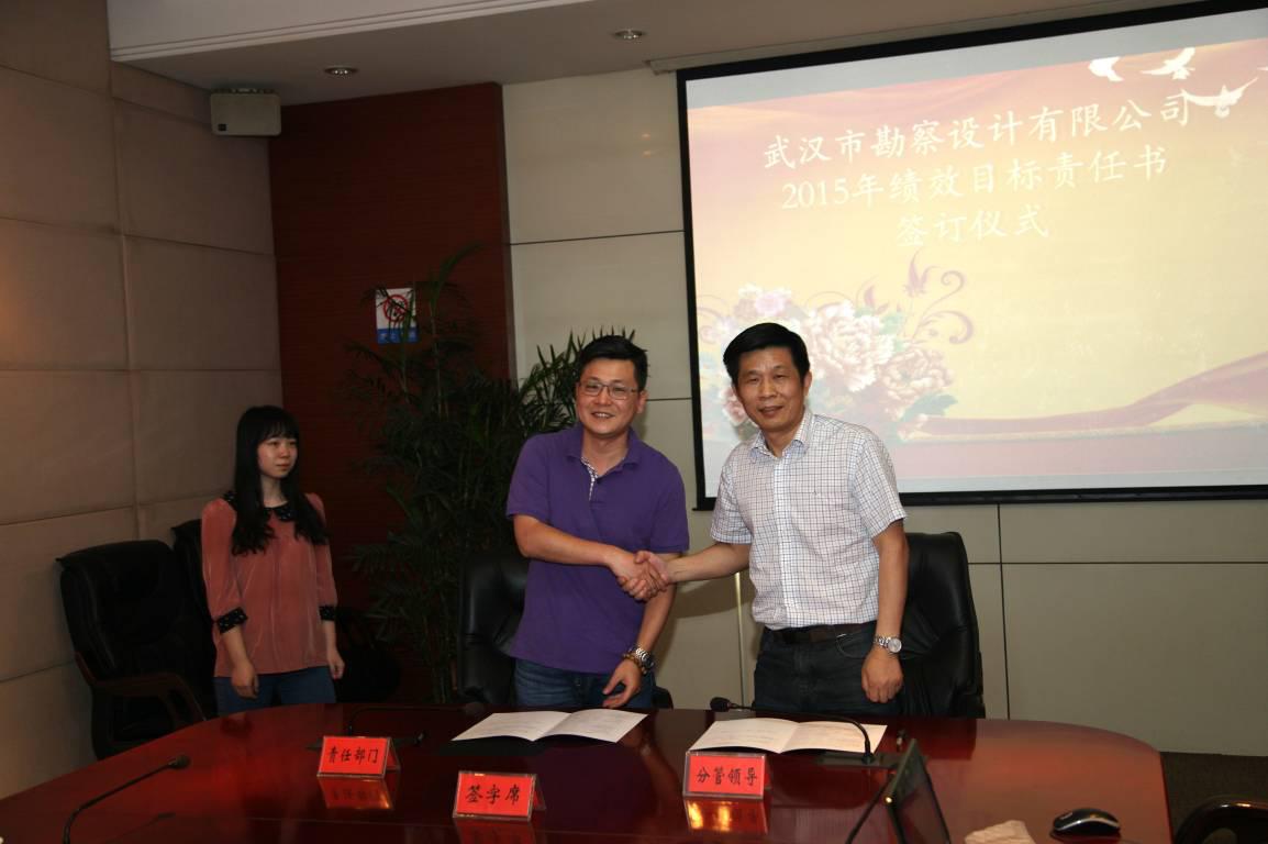 2015年5月14日,公司績效目標領導小組組織召開了隆重的“勘察公司2015年績效目標責任書簽訂儀式”。公司高層管理人員分別與各分管部門負責人簽訂了部門績效目標責任書,為勘察公司年度績效目標的完成攜手努力,共同推動公司各項生產及管理工作高效有序開展,為客戶提供優(yōu)質可靠的服務,提升公司品牌影響力和行業(yè)地位。通過年度績效目標任務的落實,逐步實現勘察公司中長期發(fā)展戰(zhàn)略目標。