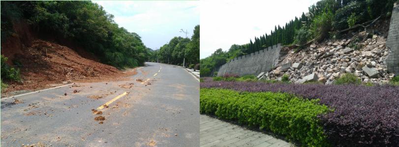 7月7日,受連日降雨影響,東湖新技術開發區頂冠峰山體因雨水沖刷浸泡,穩定性降低,誘發土體滑坡。受東湖新技術開發區國土資源和規劃局的委托,巖土一公司副經理彭華中帶領技術團隊第一時間趕到滑坡現場,冒著坡體進一步垮塌的危險爬上山頂,察看滑坡體后緣,了解滑坡性質。對滑坡原因進行了深入分析,由于頂冠峰南側表層以坡殘積土為主、坡率大,大量降雨滲入土體中,土體軟化,降低了巖體抗剪切能力,導致滑坡發生。技術團隊當日編制了該滑坡的應急調查報告并呈報至區國土與規劃分局,為隨后的地質災害應急避險及治理提供了可靠的依據。在現場勘測和技術分析后,公司技術人員又不辭辛苦,挨家挨戶地發放地災救治、避險應急宣傳資料,講解地災防治知識。妥善安頓隱患點周邊村民后,又馬不停蹄的投入到隱患排查和治理措施研究中。
