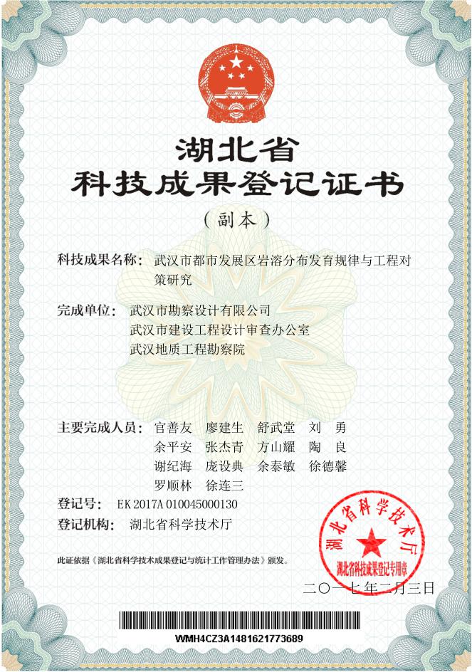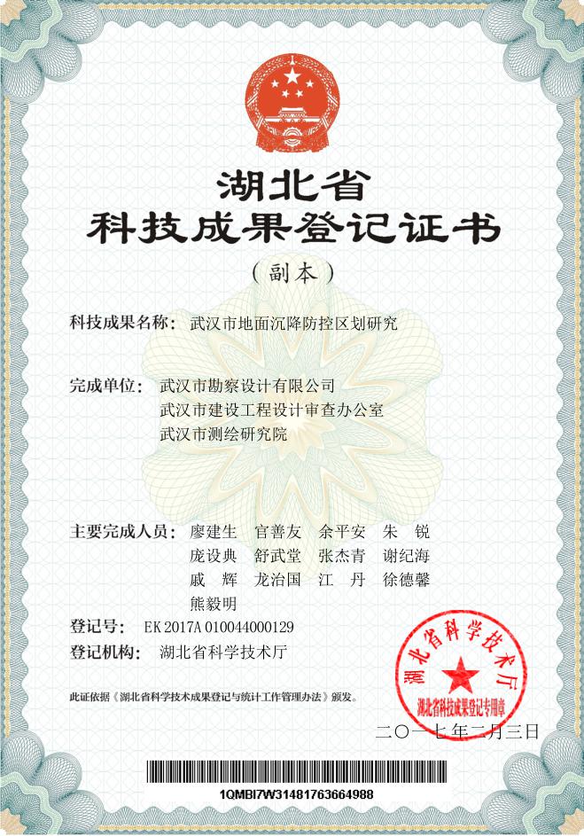 勘察公司作為地質災害防治領域的技術咨詢服務公司,在市規(guī)劃局和城建委的領導和指示下,迅速組成以廖建生董事長兼總經(jīng)理、官善友副總經(jīng)理兼總工程師為核心的創(chuàng)新團隊,開展地質災害防治技術和科學研究。經(jīng)過數(shù)年的深入解析和潛心鉆研,率先取得了地質災害防治領域國內領先的科技成果:主持的科研項目《武漢市都市發(fā)展區(qū)巖溶分布發(fā)育規(guī)律與工程對策研究》和《武漢市地面沉降防控區(qū)域研究》通過了湖北省科技廳組織的科技成果鑒定,鑒定專家委員會一致認為項目研究成果總體達到國內領先水平,由省科技廳頒予《湖北省科技成果登記證書》。為武漢市地質災害防治和地質環(huán)境保護提供了科學精準的基礎資料、技術措施和應用成果,為武漢市生態(tài)城市建設充分發(fā)揮出了人才、技術和科技優(yōu)勢。